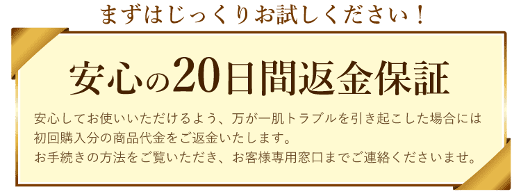 NNEファンデーションでは、万一にお肌のトラブルがあった場合は、20日間に限り返金保証もついておりますので、安心してご利用することが可能です。