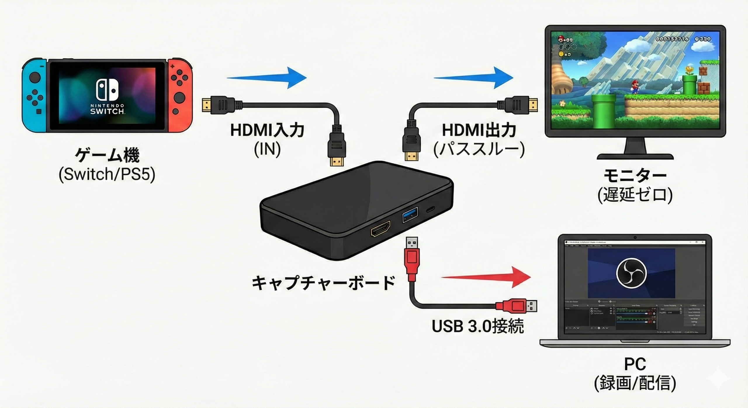 推奨: リアルタイム性を重視するなら、キャプチャーボードから**別のモニターへ直接映像を出す「パススルー」**を必ず使用しましょう。これにより、プレイ画面の遅延はゼロになります。