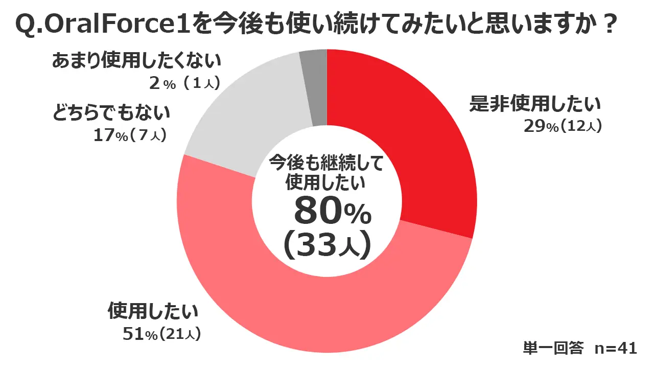 また、アンケートにて約80%の医師が「今後も継続して使用したい」と回答しています。医療従事者の視点と犬の飼い主としてもその効果や使いやすさが高く評価される結果を残しております。