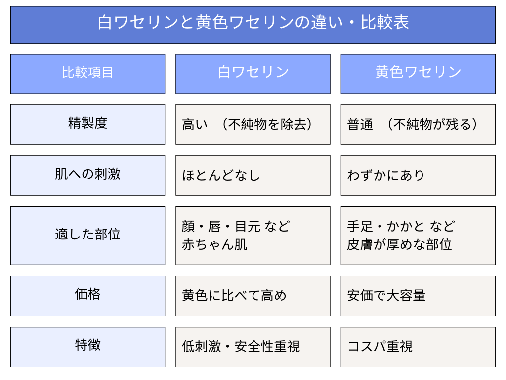 黄色ワセリン: 精製度が低く、不純物が少し残っているもの。安価ですが、紫外線に反応して酸化しやすく(油焼け)、顔に塗るとシミやかぶれの原因になることがあります。