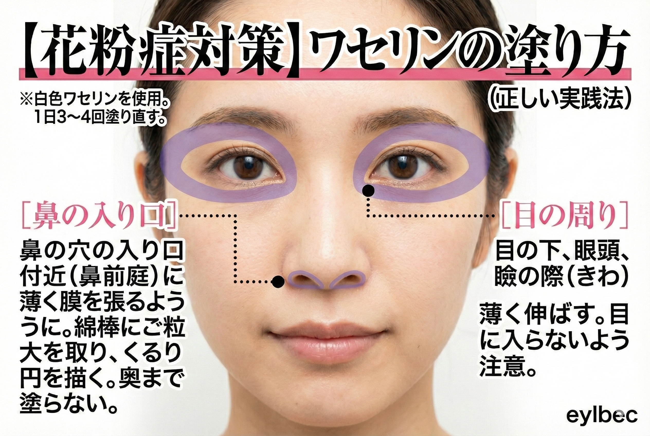 裏技として、**「まつ毛の先端」**にほんの少しだけ塗るのも有効です。 まつ毛が粘着力を持つことで、目に入ろうとする花粉をキャッチする「ハエ取り紙」のような役割を果たします。 コンタクトレンズを使用している方や、運転をする方は、視界を遮らないよう特に慎重に行ってください。